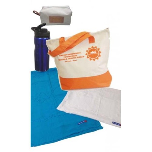Kit praia personalizada contendo : 1 Canga Personalizada confeccionadas em tecido viscose , com as medidas 87 x 1,40 , com gravação em silk (chapada ) no máximo até 03 cores sobre área máxima de 40 x 50 cm.
