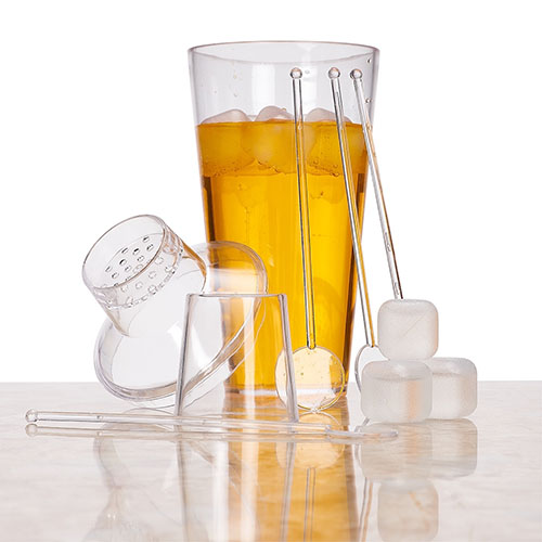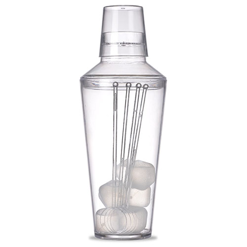 Coqueteleira de acrílico com cubos de gelo ecológico e misturadores. Copo com capacidade de 600ml, possui tampa de encaixe com peneira além e um pequeno copo(shot) também utilizado como tampa superior. Acompanha 4 misturadores e 8 gelos ecológicos – um modo prático de manter seu drink gelado sem alterar seu sabor ou concentração. Após utilização deverá ser higienizado com água, detergente neutro e uma esponja macia