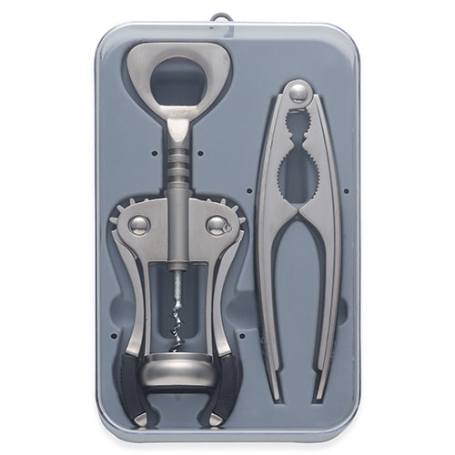 Kit com Abridor de vinho em metal e quebra nozes em estojo plástico de tampa acrílica. Abridor e quebra nozes em metal fosco com detalhes emborrachado nas laterais.