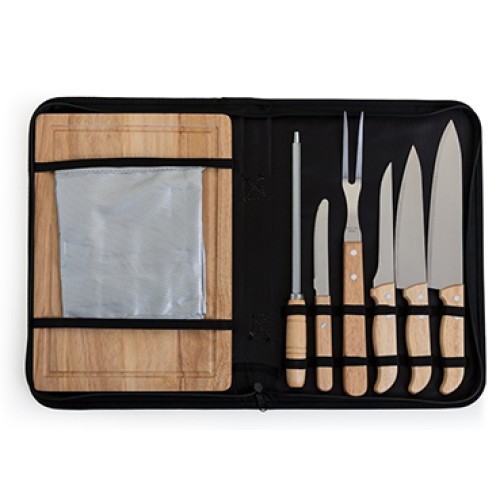 Kit para Churrasco 8 peças com cabo em Bambu, laminas em aço Inox e avental. Acompanha tábua em bambu com canaleta, 3 facas de corte e uma faca de serra cabo, chaira, garfo, e avental com bolso na cor prata. Acomodados em uma maleta em nylon preta, costura com zíper . Rebites em Aço Inox, um dos mais resistentes à ferrugem e corrosão.
