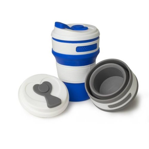Copo de silicone retrátil com capacidade de 350ml, livre de BPA. Contém aderência ao segurar na parte superior do copo, tampa de encaixe com bocal e protetor. Acompanha manga protetora antiderrapante.